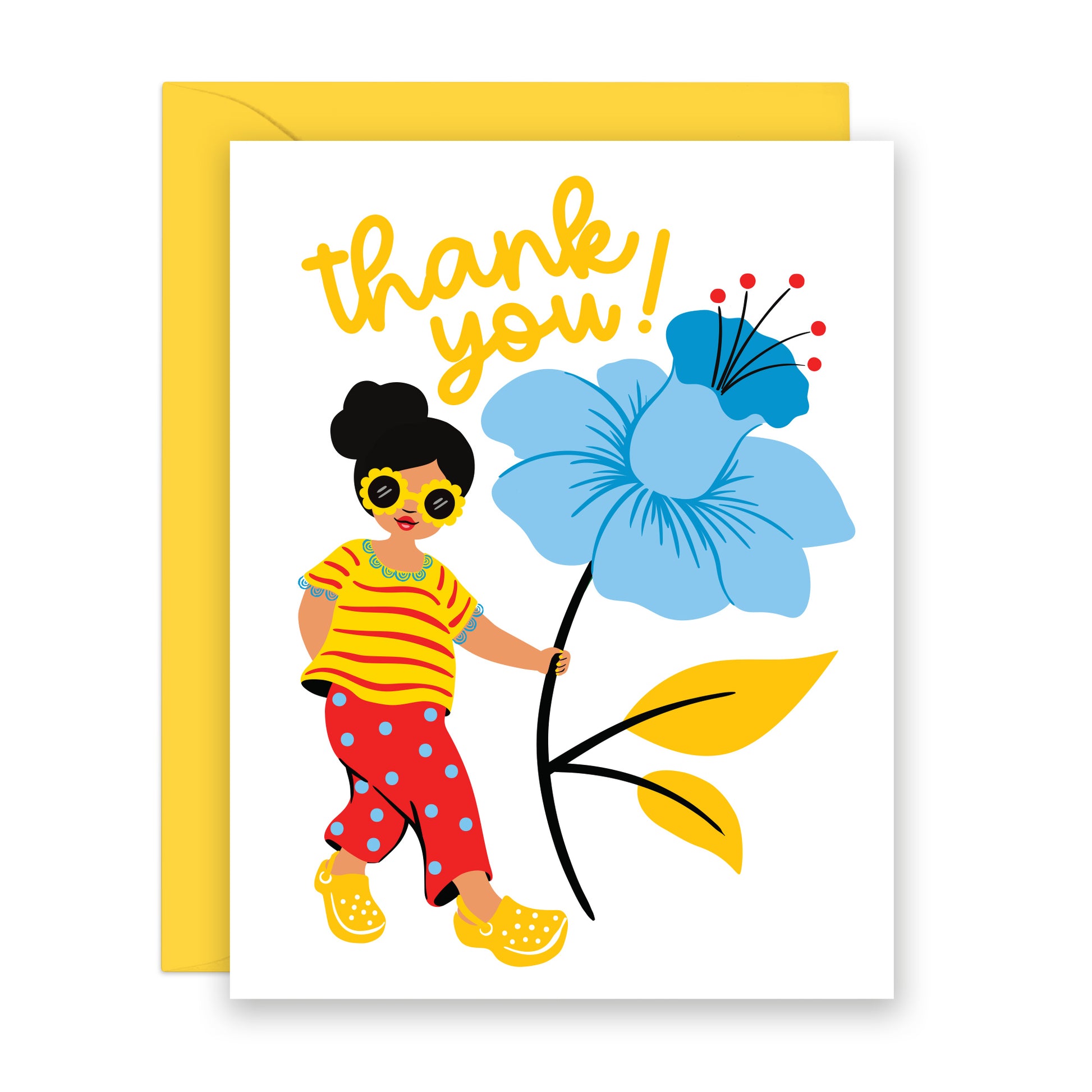 Featuring a girl wearing daisy sunglasses, colorful prints, bright yellow Crocs and holding a blue flower, as big as her gratitude for you!