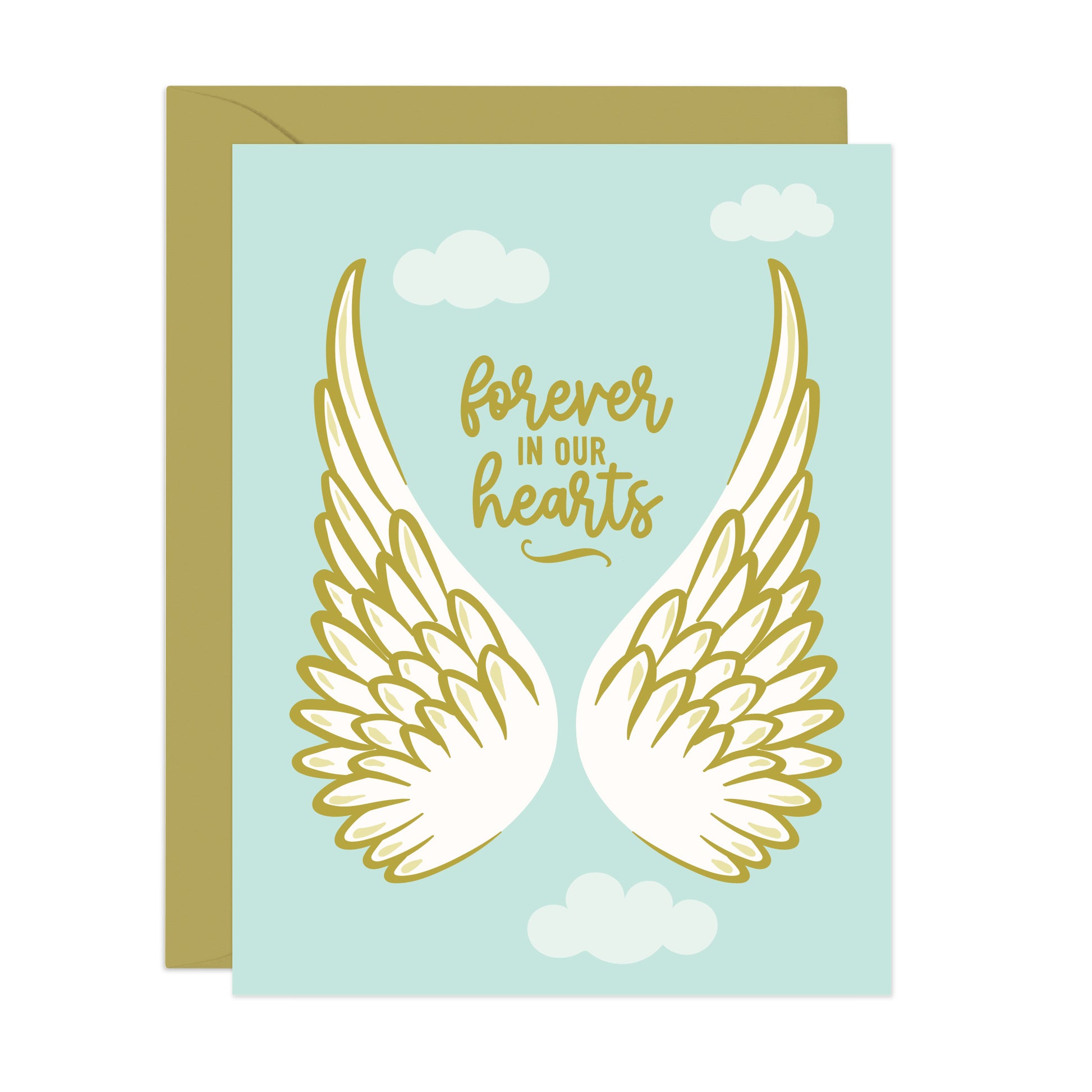 Featuring beautiful white wings flying in the sky paired with the message "Forever In Our Hearts". This heartfelt card offers a gentle way to express condolences and support during a difficult time. A thoughtful way to honor a loved one's the memory.