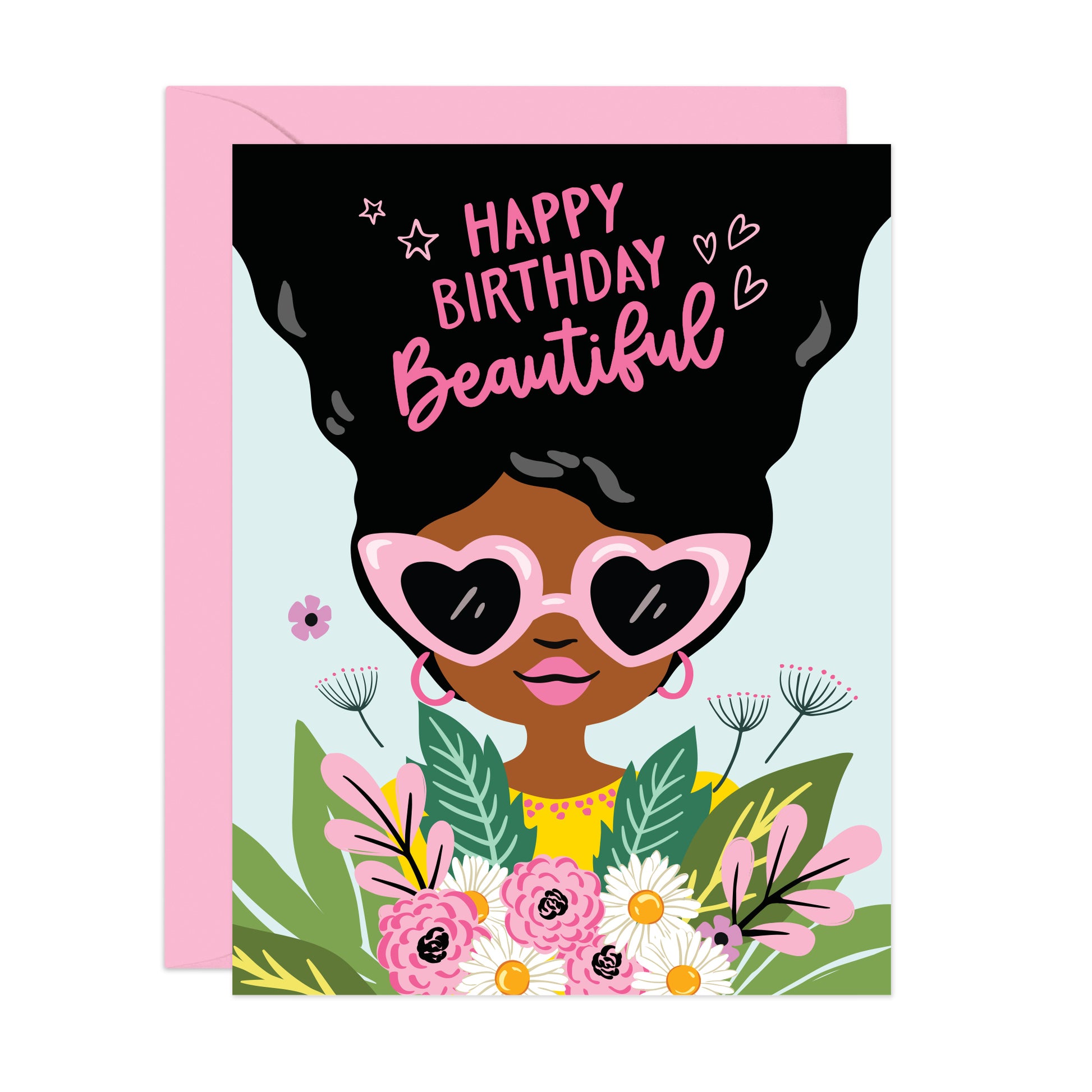 Featuring one of Lucy Loves Paper's illustrated girls with pink heart sunglasses and curly black hair among colorful blooming flowers. Or her flowing hair we read the message "Happy Birthday Beautiful". Perfect for: black woman birthday, black girl magic, spring birthdays, bold vibes, bff